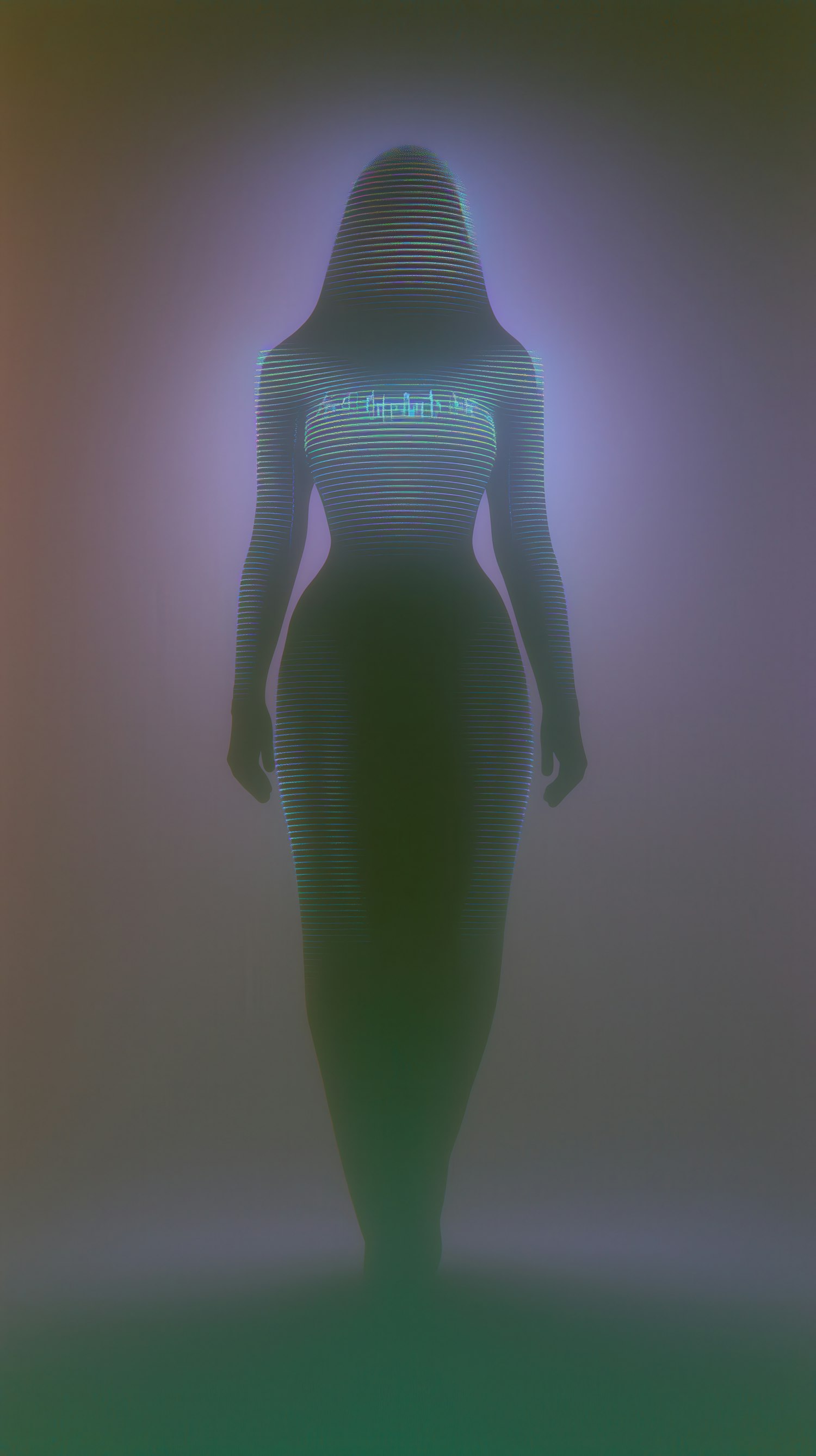 A glowing holographic humanoid figure with striped lines, set against a gradient background of greens and purples. Futuristic and abstract.