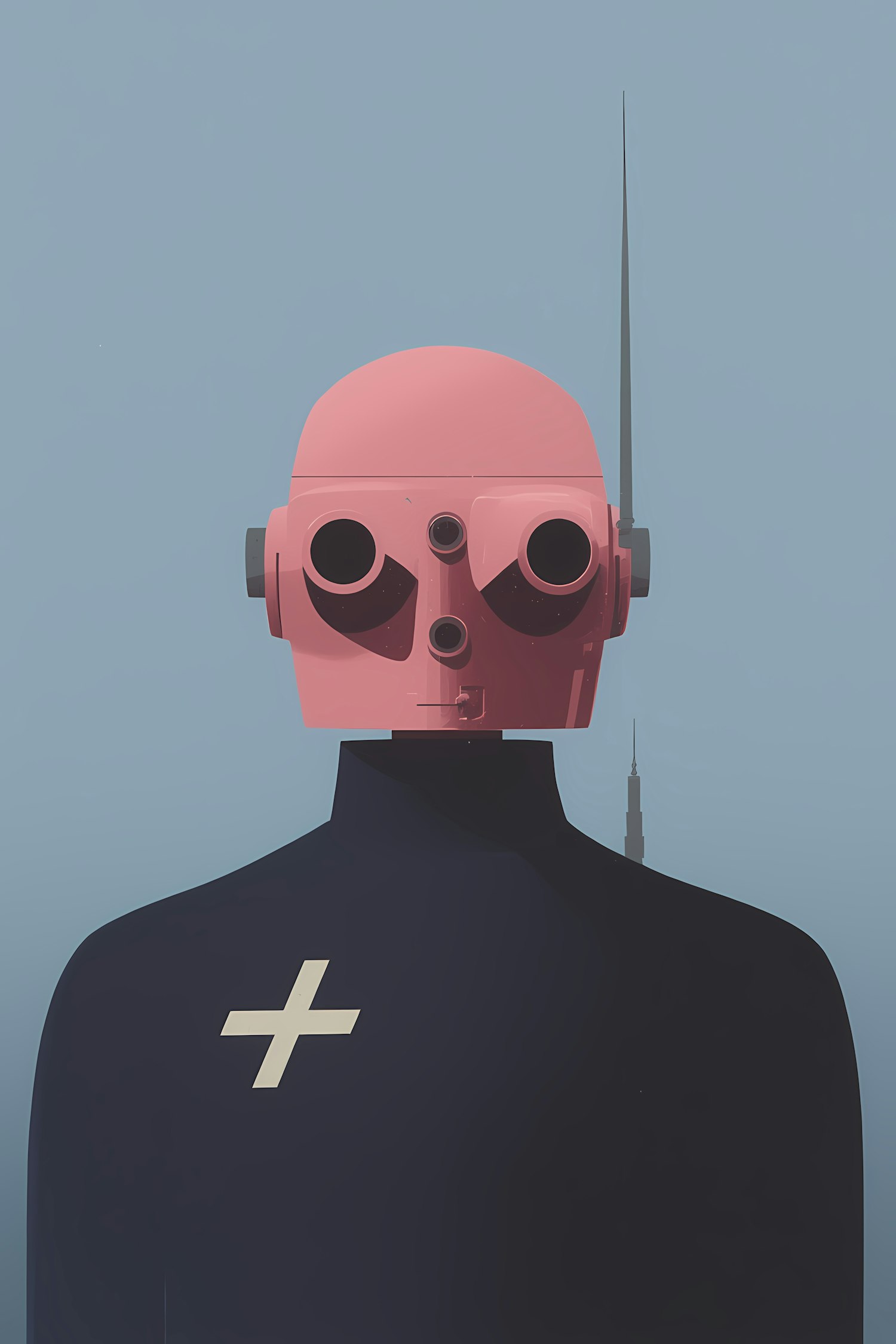 A futuristic humanoid figure with a pink robotic head and a dark outfit featuring a white cross, set against a gradient blue background.