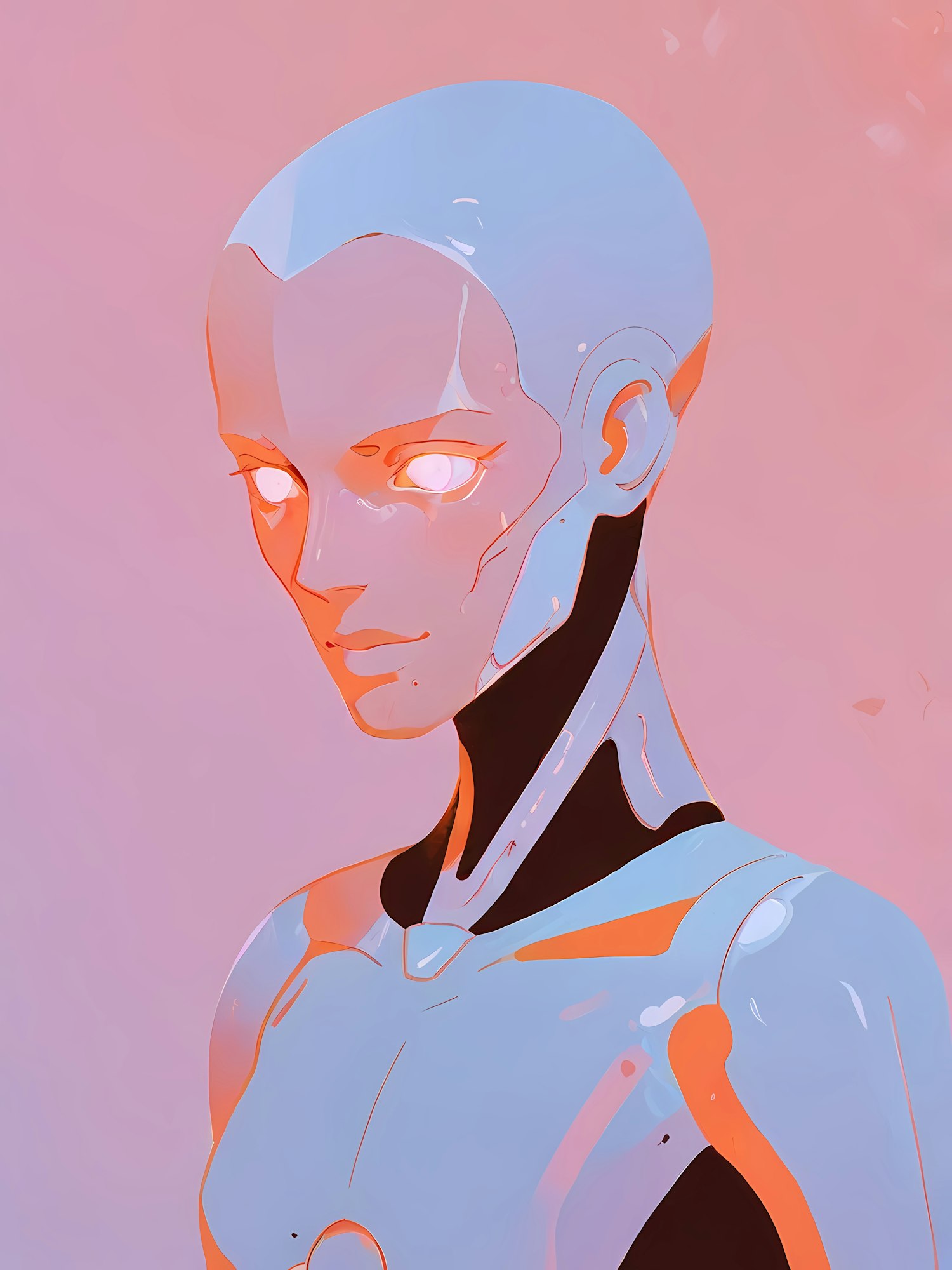 Futuristic humanoid with metallic skin and glowing eyes against a pastel pink background, blending sci-fi and serene aesthetics.
