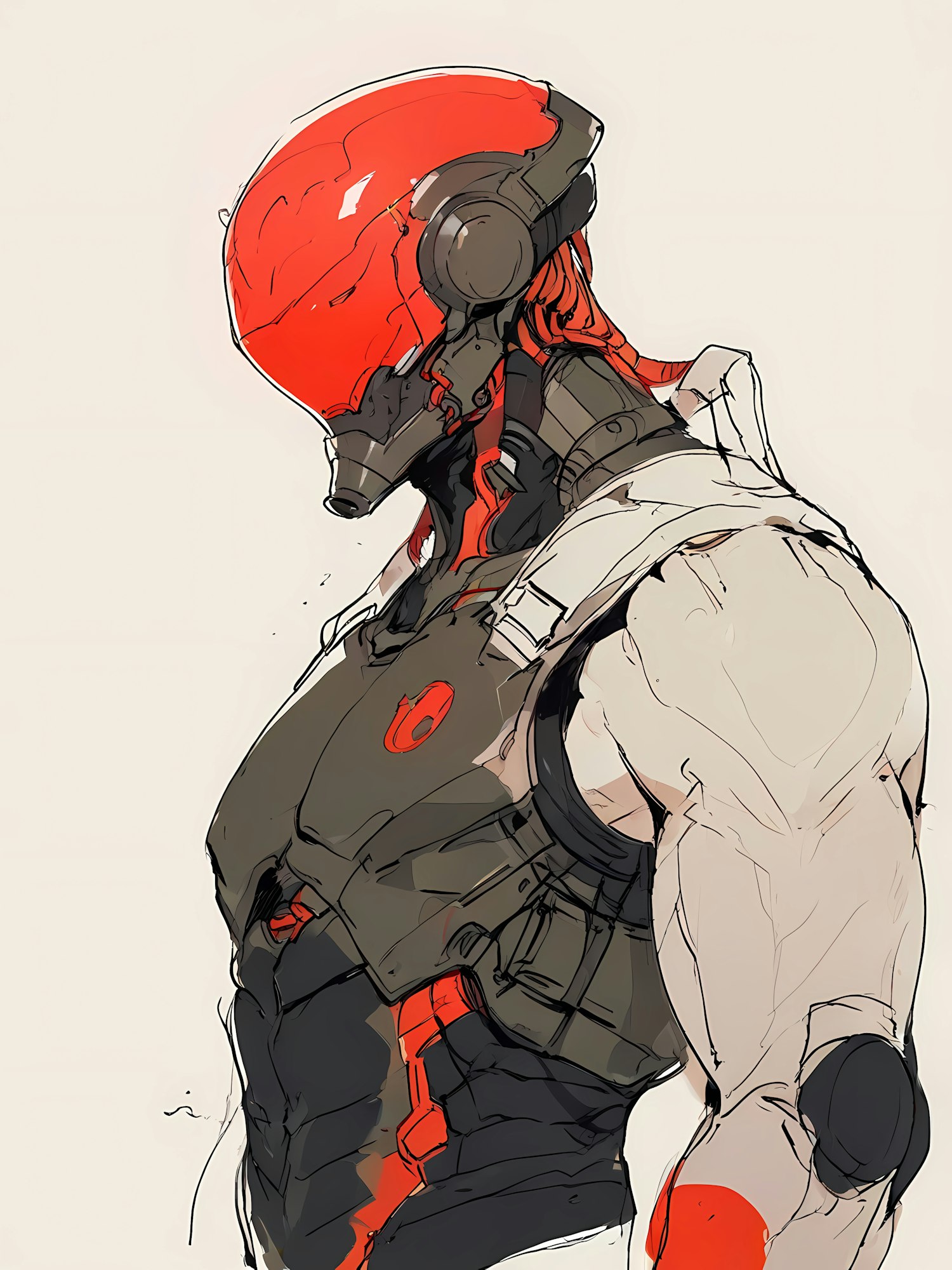 Futuristic humanoid with a sleek red helmet and dark armor, exuding a powerful and agile presence against a light background.