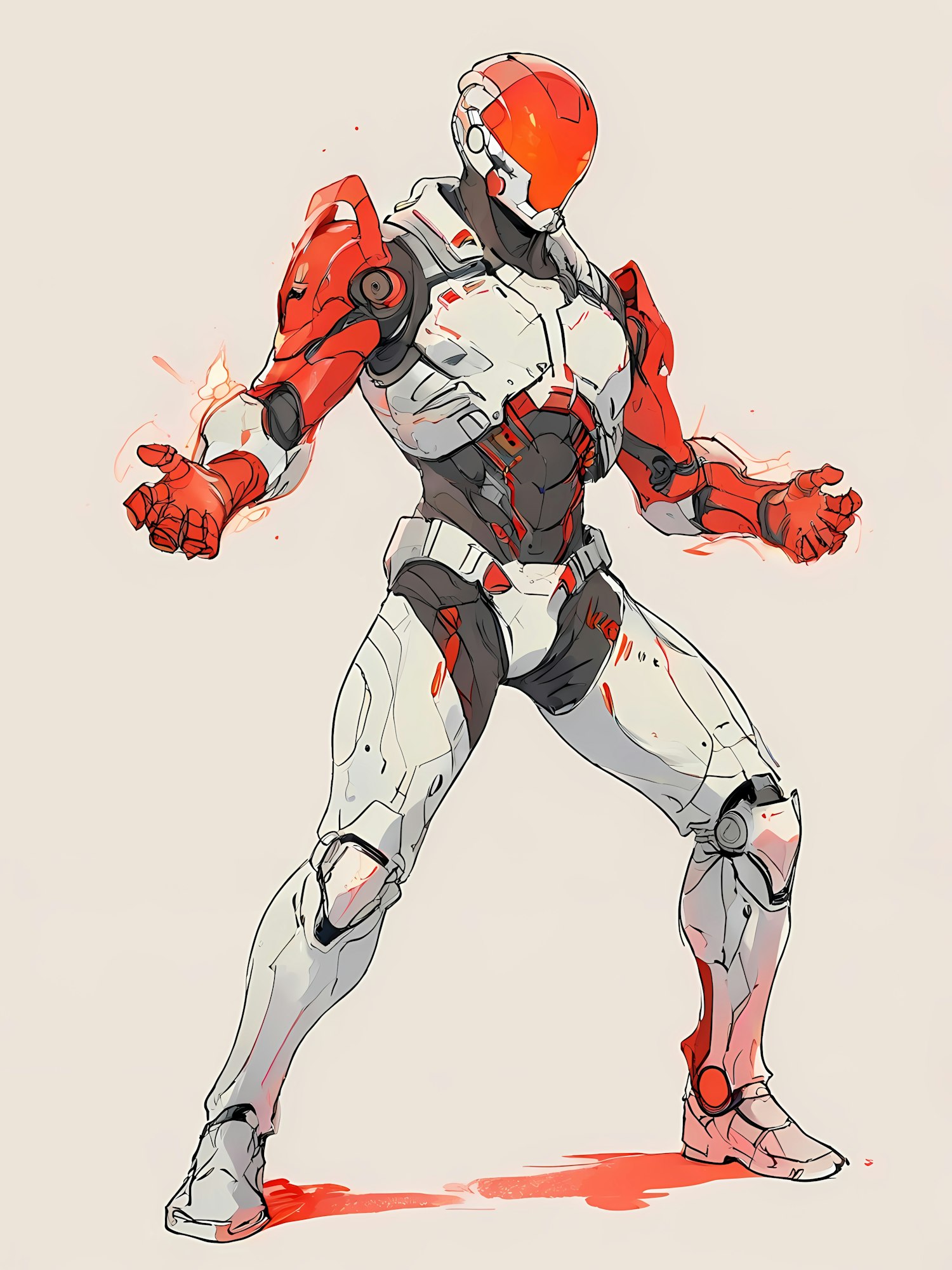 Futuristic armored figure with sleek white and red design, standing in a dynamic pose with glowing hands, exuding power and readiness.