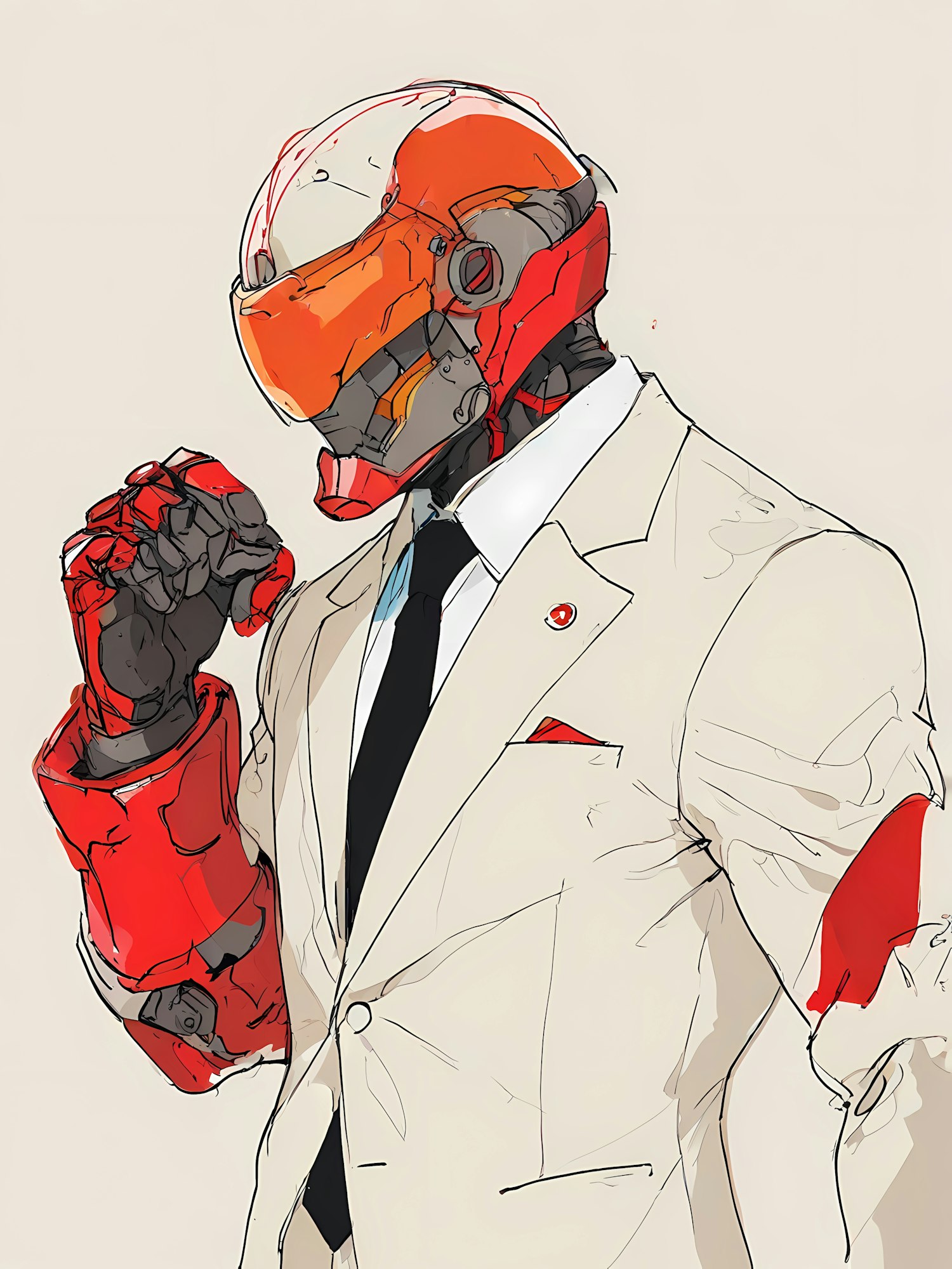 Futuristic robot in a white suit with red and orange accents, exuding elegance and readiness. Sleek design with a clenched fist.