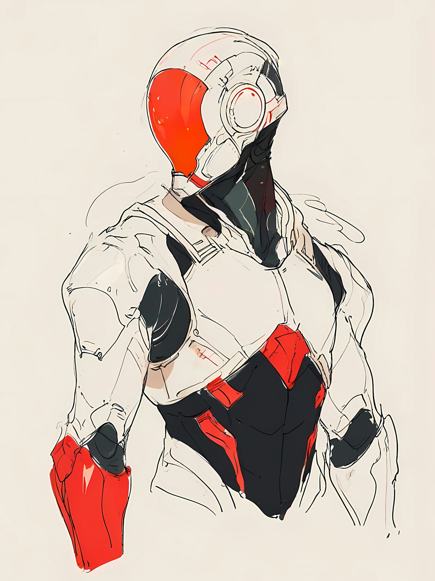 Futuristic armored suit illustration with white, red, and black accents, featuring a sleek helmet and streamlined design.