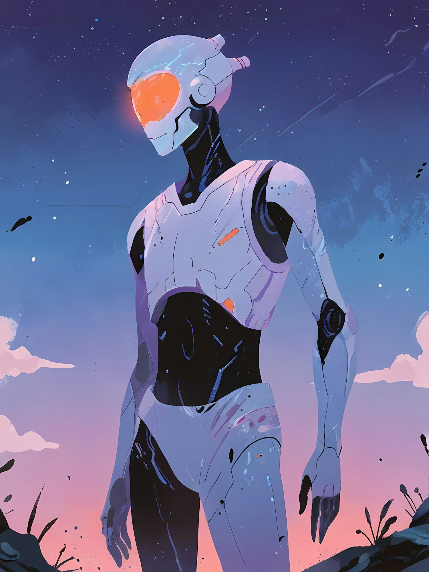 Futuristic robot with glowing visor stands against a twilight sky, blending technology and art in a surreal landscape.