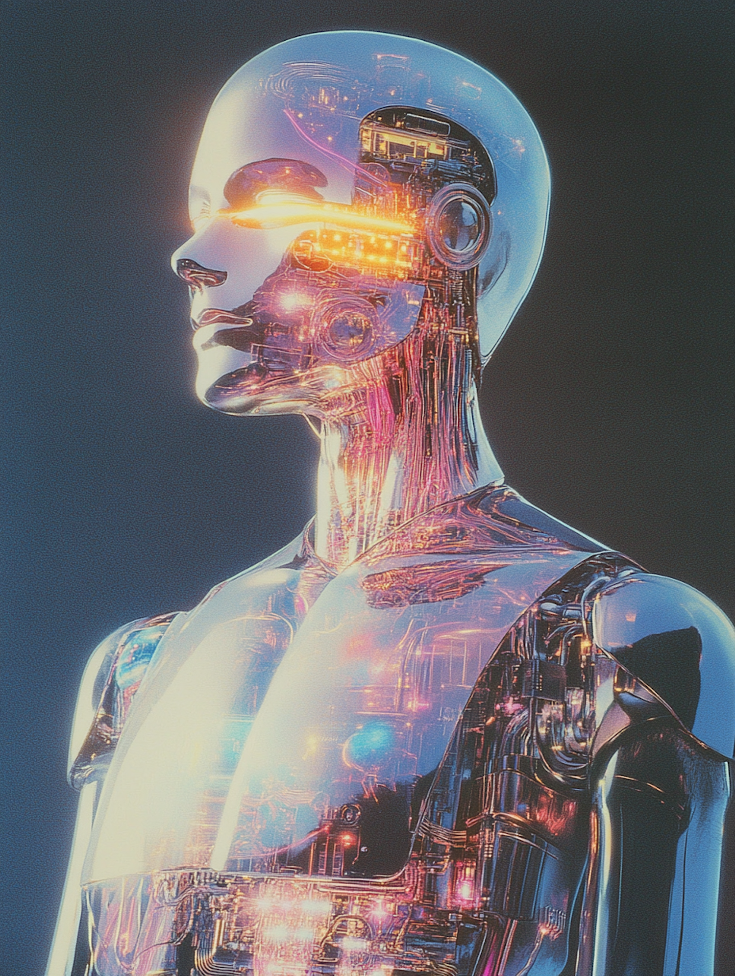 Futuristic humanoid robot with glowing internal circuitry and sleek metallic design, showcasing advanced technology.