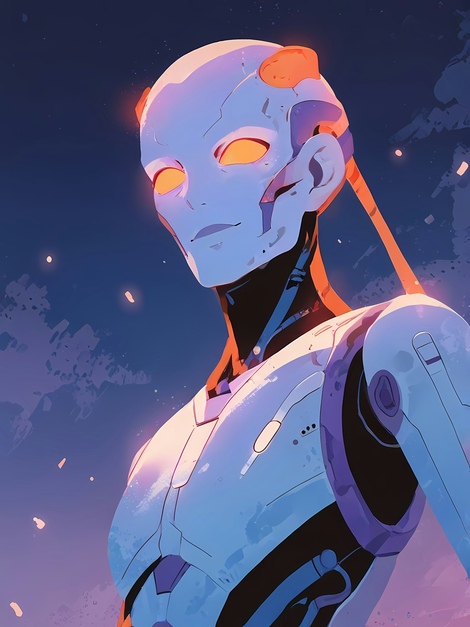 Futuristic humanoid robot with glowing orange eyes against a starry night sky, exuding a sleek and confident presence.