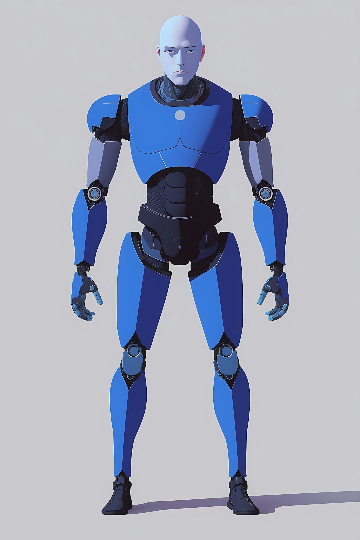 A futuristic humanoid robot with a sleek blue and black design, standing against a plain background, showcasing its advanced articulation.