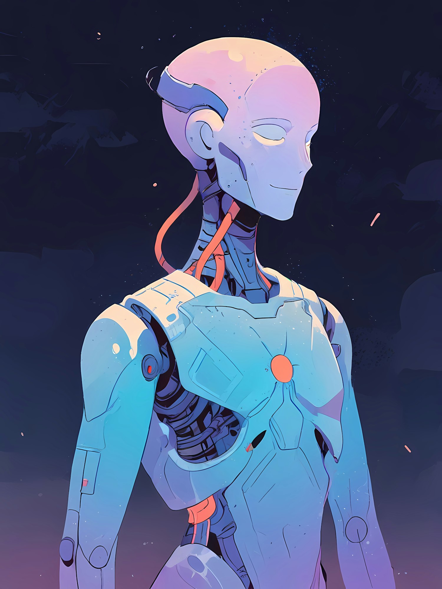 Futuristic humanoid robot with a sleek design, glowing accents, and intricate mechanical details against a starry backdrop.