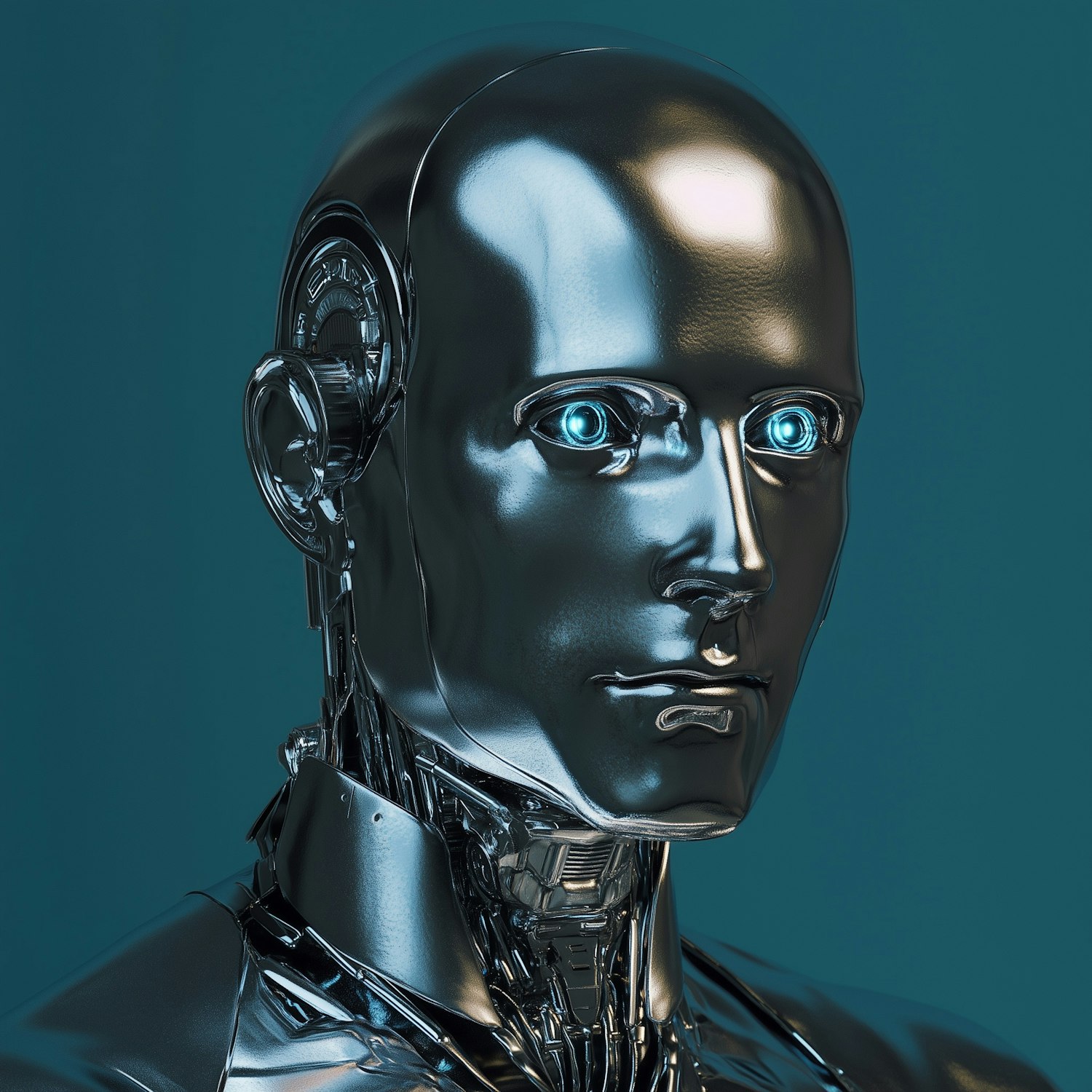 Futuristic humanoid robot with a chrome finish, glowing blue eyes, and intricate mechanical details on a teal background.