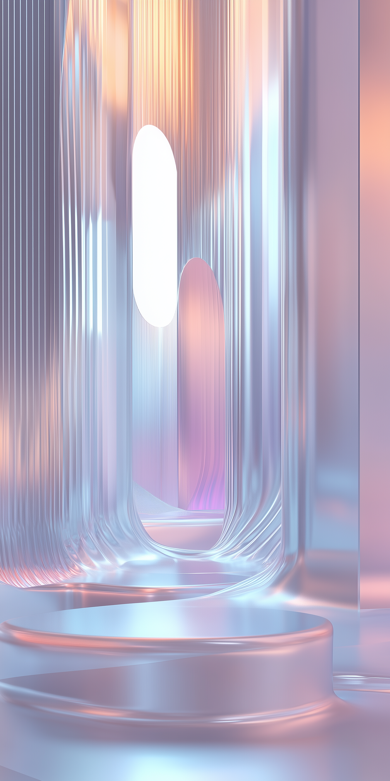 Futuristic interior with pastel hues, ribbed walls, and glowing light through oval openings, creating a surreal and ethereal ambiance.