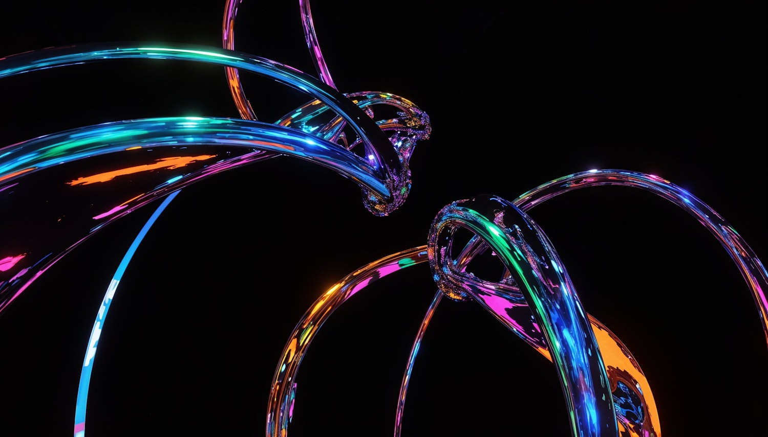 Vibrant, glowing tubes intertwine against a black background, showcasing electric blue, neon pink, and vivid green hues.