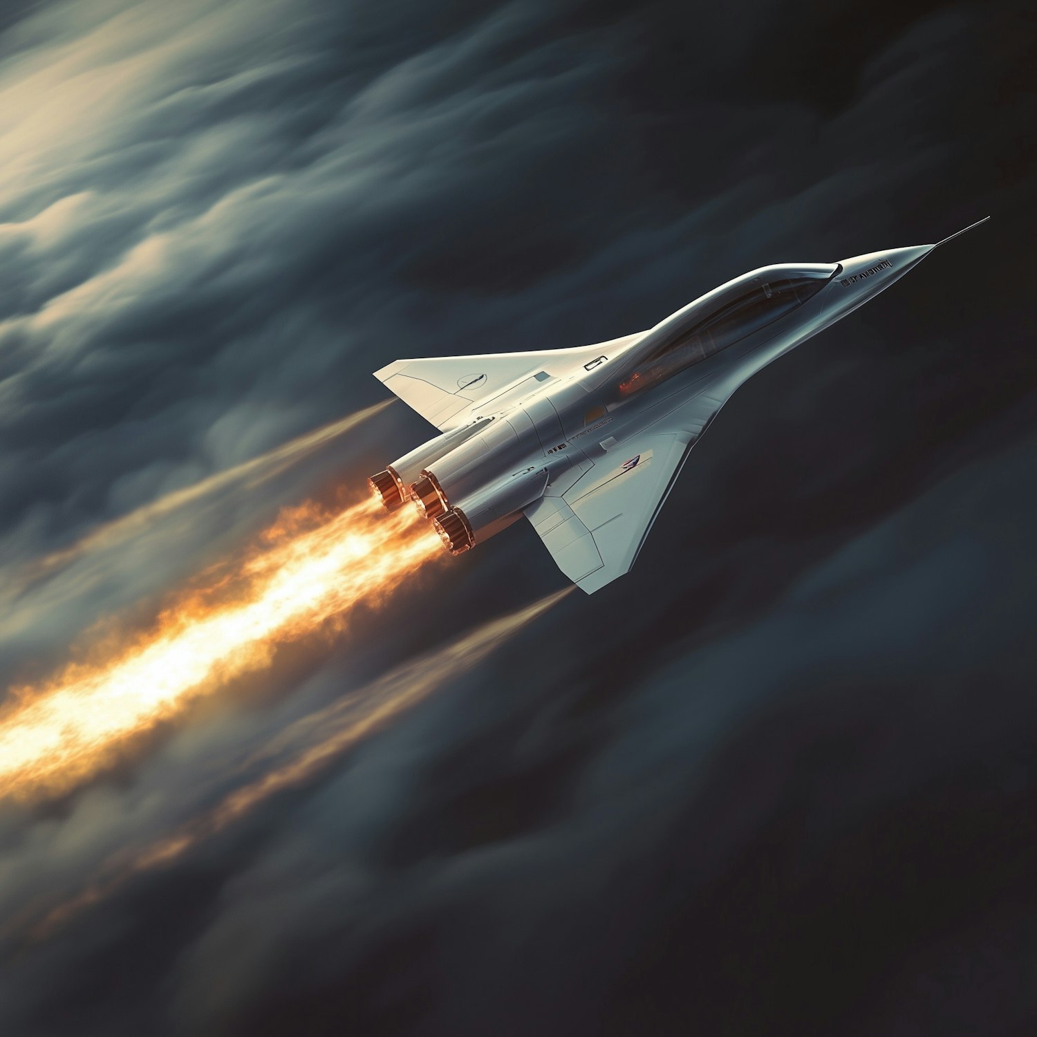 Futuristic supersonic jet with fiery exhaust streaks through dramatic clouds, showcasing cutting-edge aerospace design.