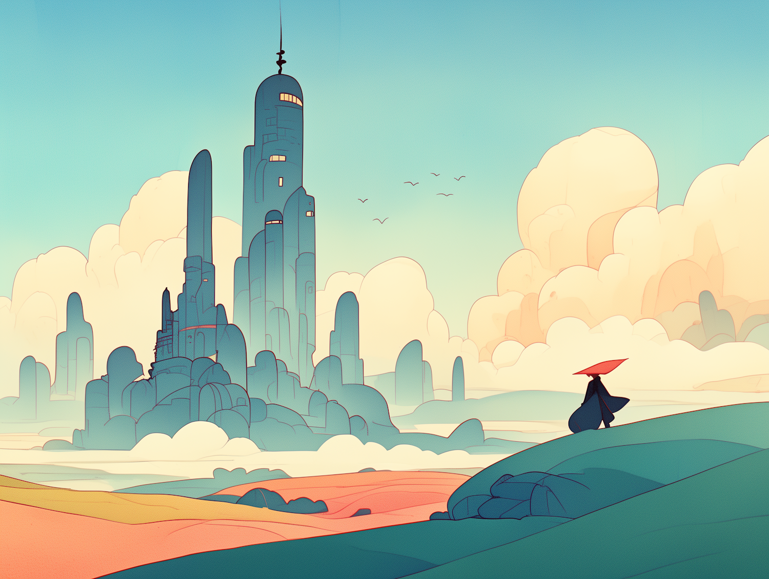 A lone figure with a red umbrella gazes at a futuristic cityscape under a serene sky. Dreamlike and harmonious illustration.