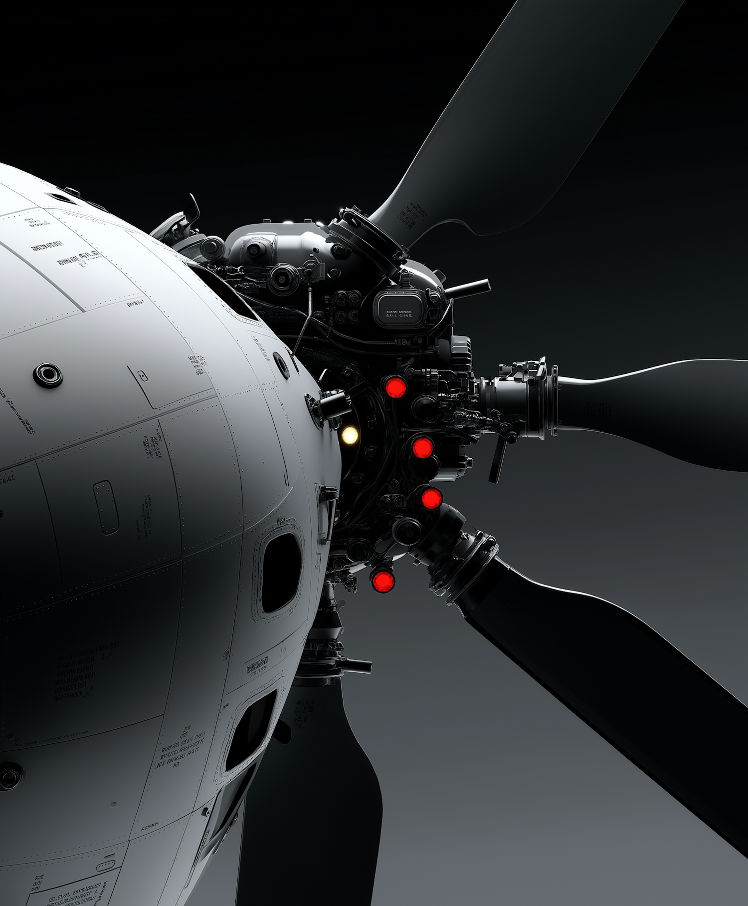 Close-up of a futuristic mechanical structure with propeller blades, glowing lights, and intricate details against a dark background.