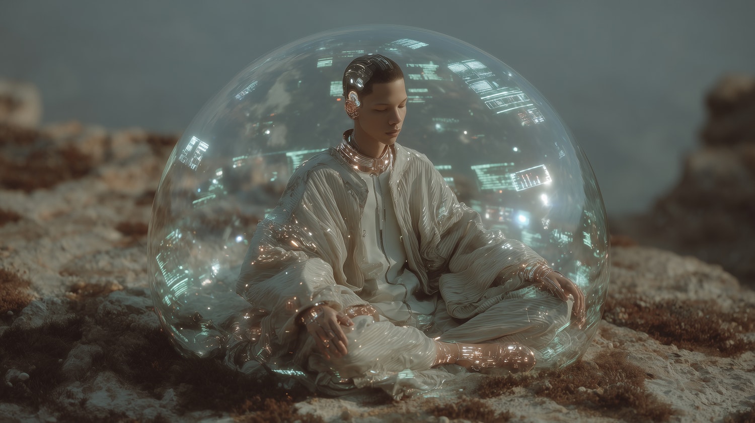 A futuristic figure meditates within a glowing dome, blending advanced technology with serene natural surroundings.
