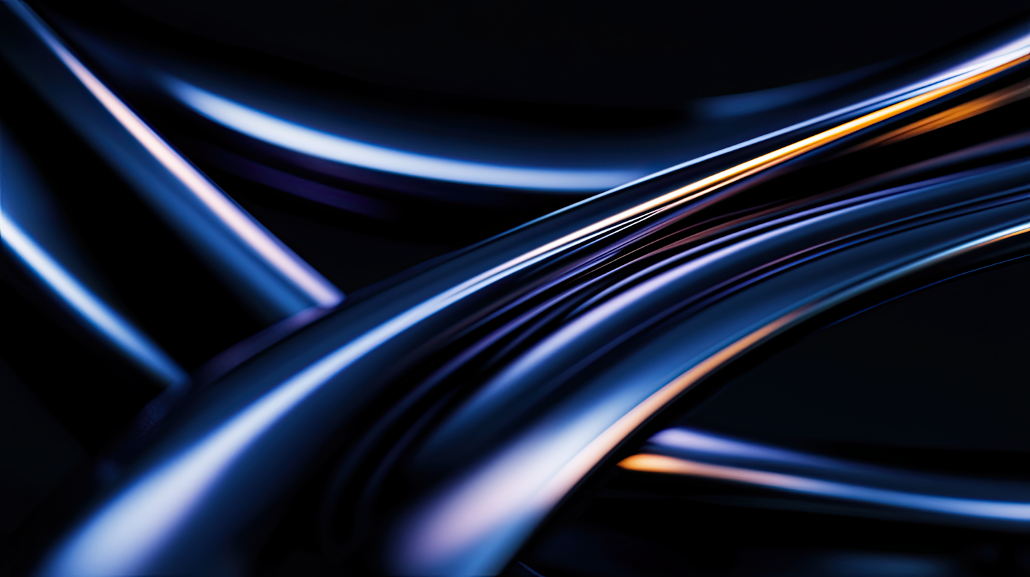 Abstract metallic curves with glossy reflections in blue, purple, and orange hues, set against a dark background for a futuristic vibe.