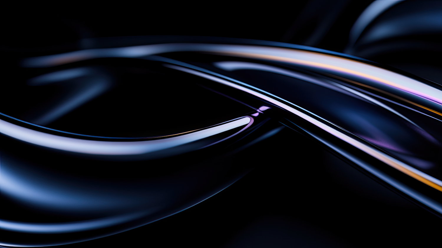 Abstract metallic curves with glossy reflections in blue, purple, and gold tones on a black background, creating a futuristic vibe.