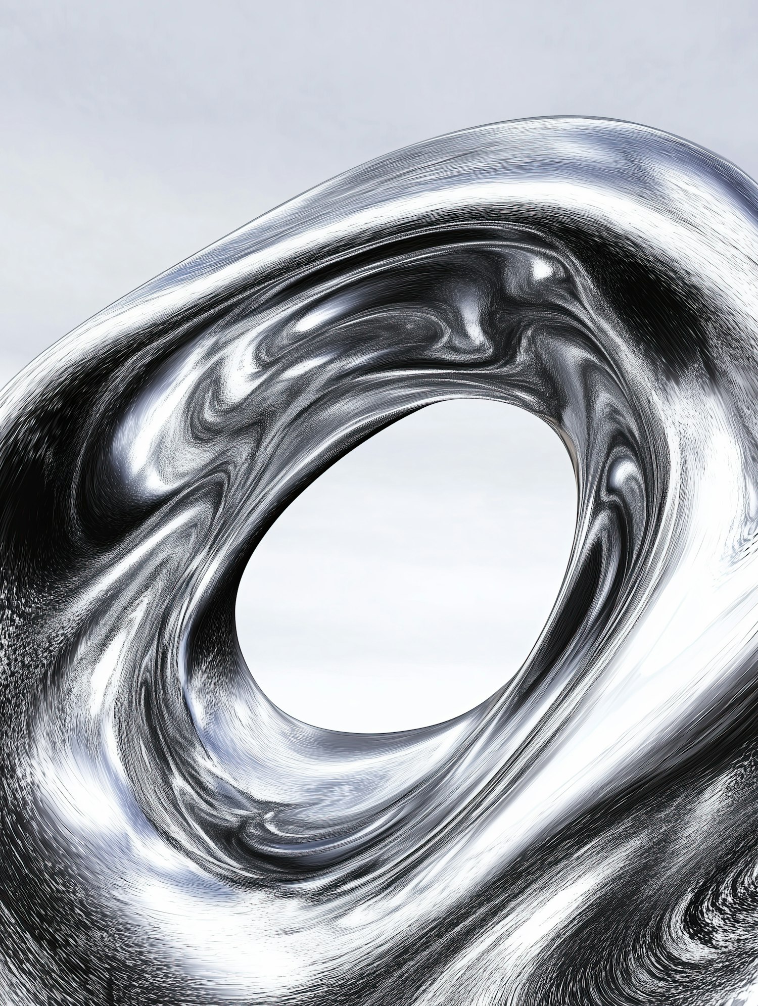 Abstract metallic loop with a reflective chrome surface and swirling design against a soft gradient sky. Futuristic and dynamic aesthetic.