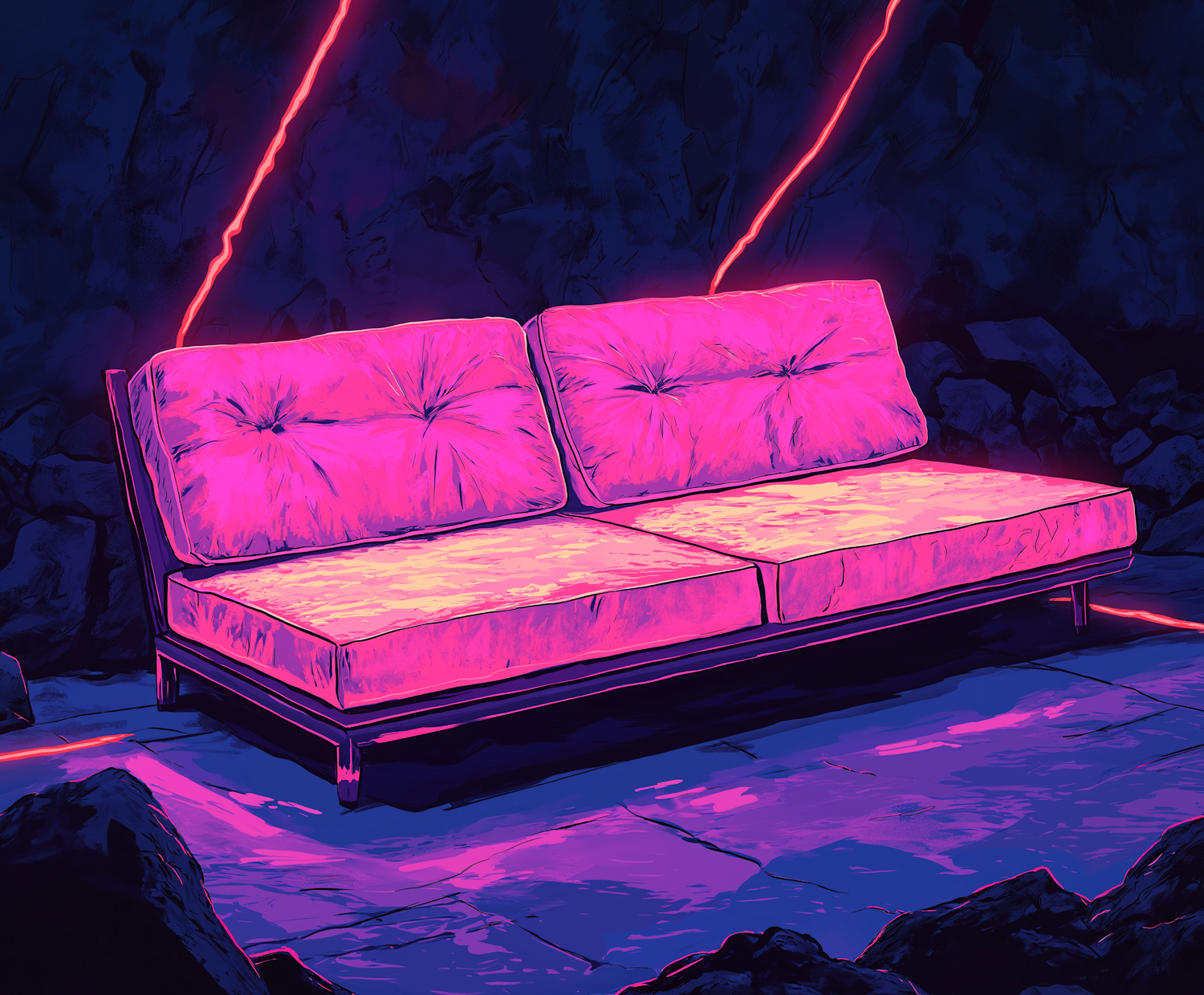 Neon pink sofa in a dark, rocky setting with vibrant lighting and futuristic energy beams.