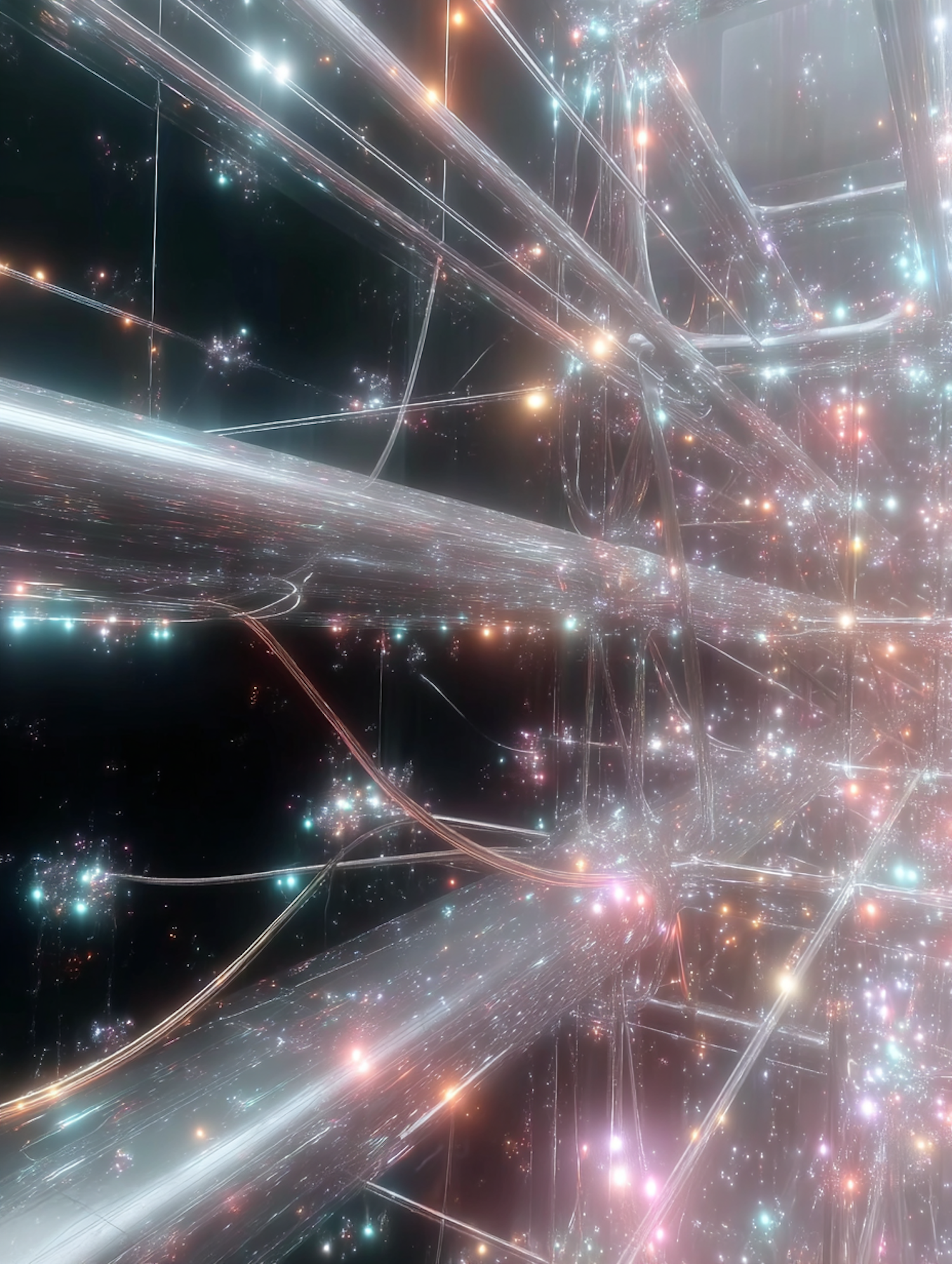 A stunning digital artwork of glowing, interconnected strands and nodes in a vibrant, futuristic network against a dark background.