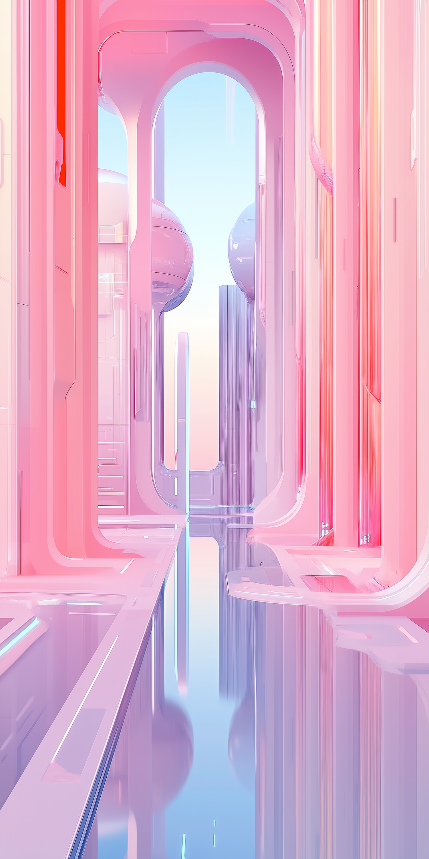 Futuristic pastel corridor with reflective floors, smooth arches, and a dreamy gradient sky. Perfect for sci-fi or utopian design inspiration.