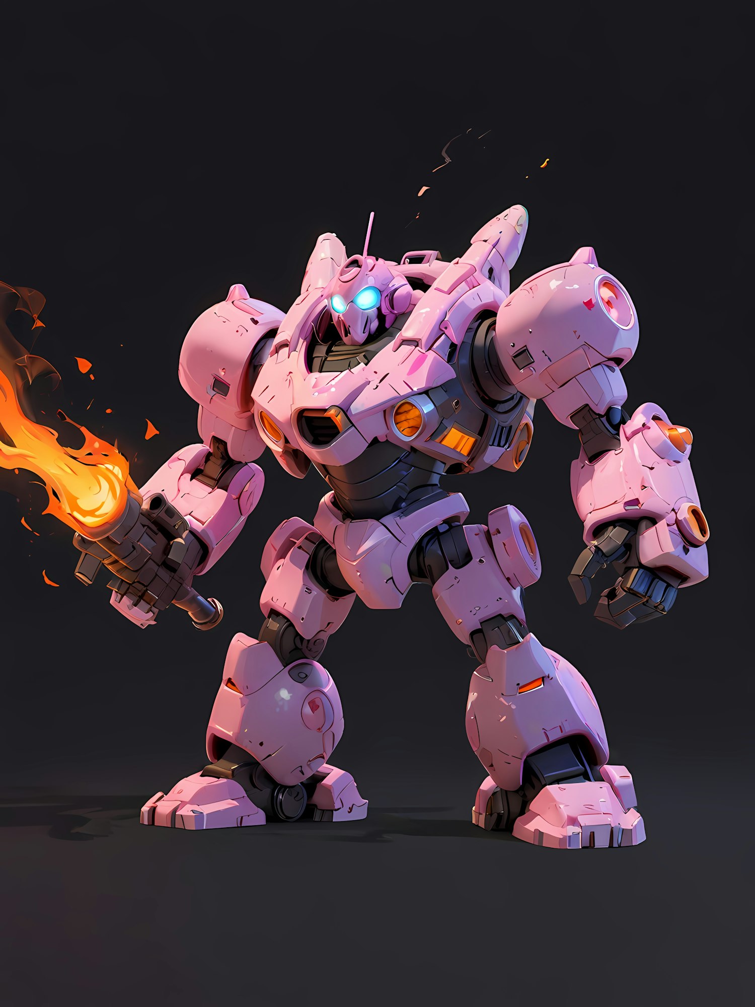 A pink combat mech with glowing blue eyes and a fiery flamethrower stands ready for action against a dark background.