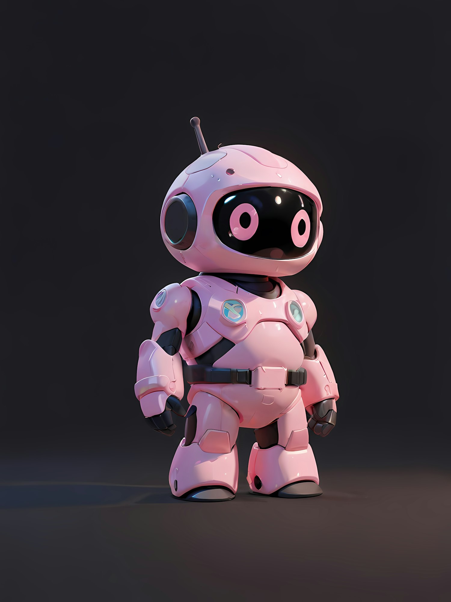 Adorable pink robot with a glossy finish and big circular eyes, standing confidently in a sleek 3D-rendered design.