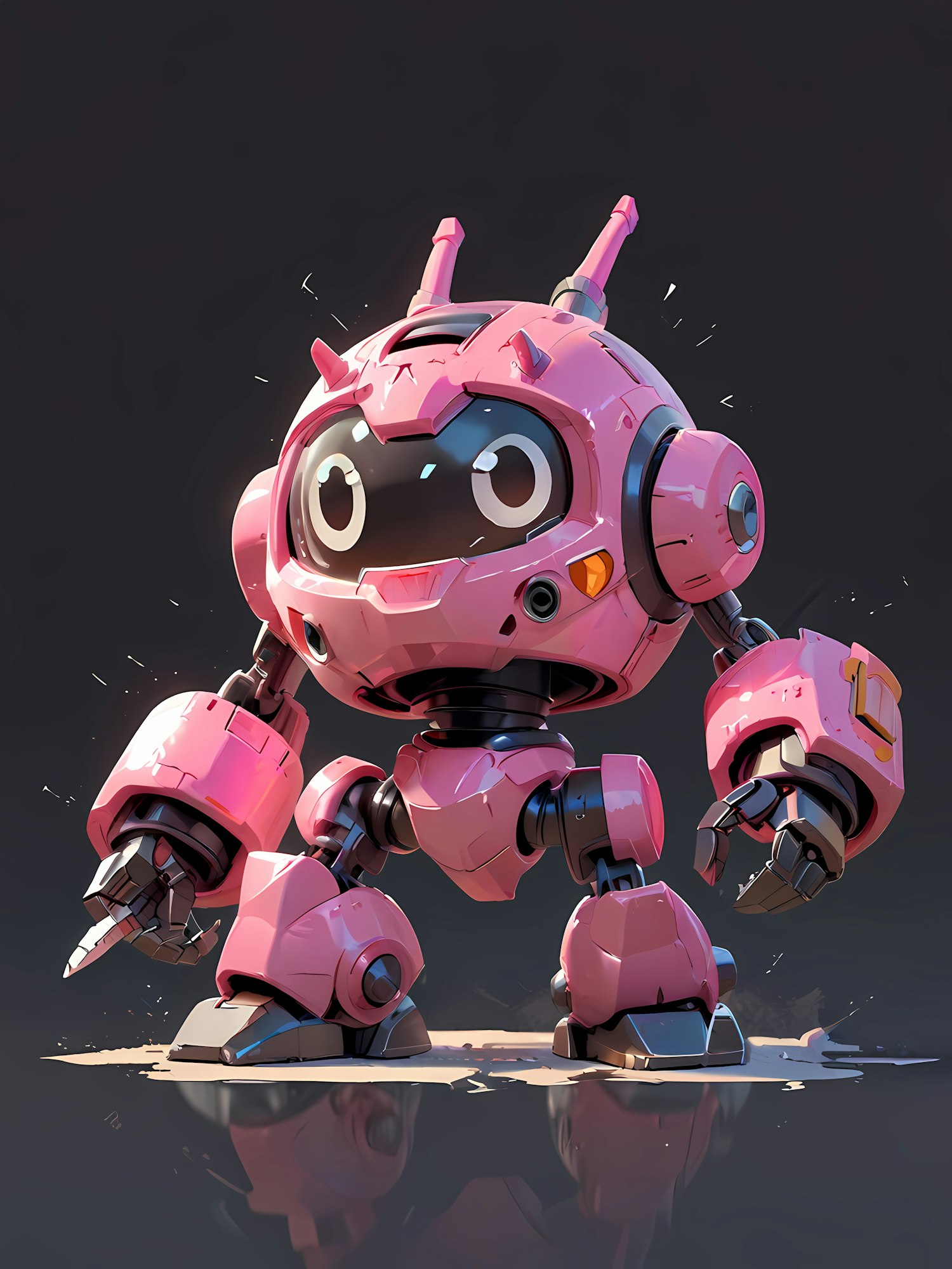Adorable pink robot with big eyes and a glossy finish, standing on a reflective surface. Futuristic and playful design!