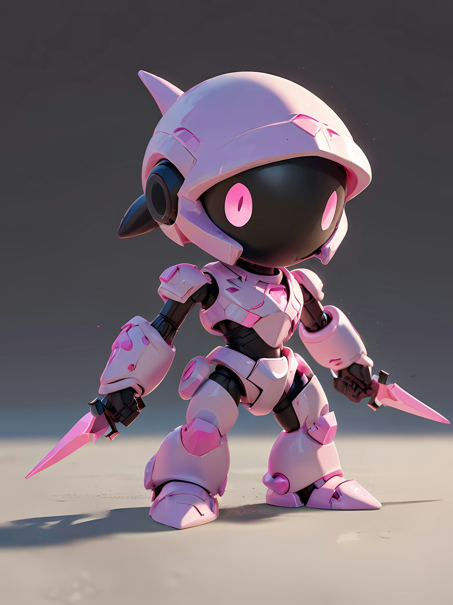 Adorable pink robot with glowing eyes and dual daggers, blending cute and combat-ready vibes in a sleek futuristic design.