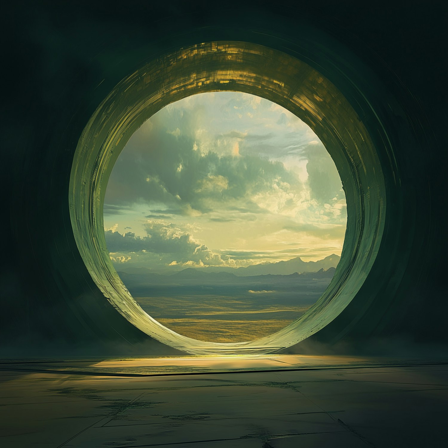 A futuristic circular portal frames a golden landscape with mountains and clouds, blending sci-fi vibes with serene natural beauty.