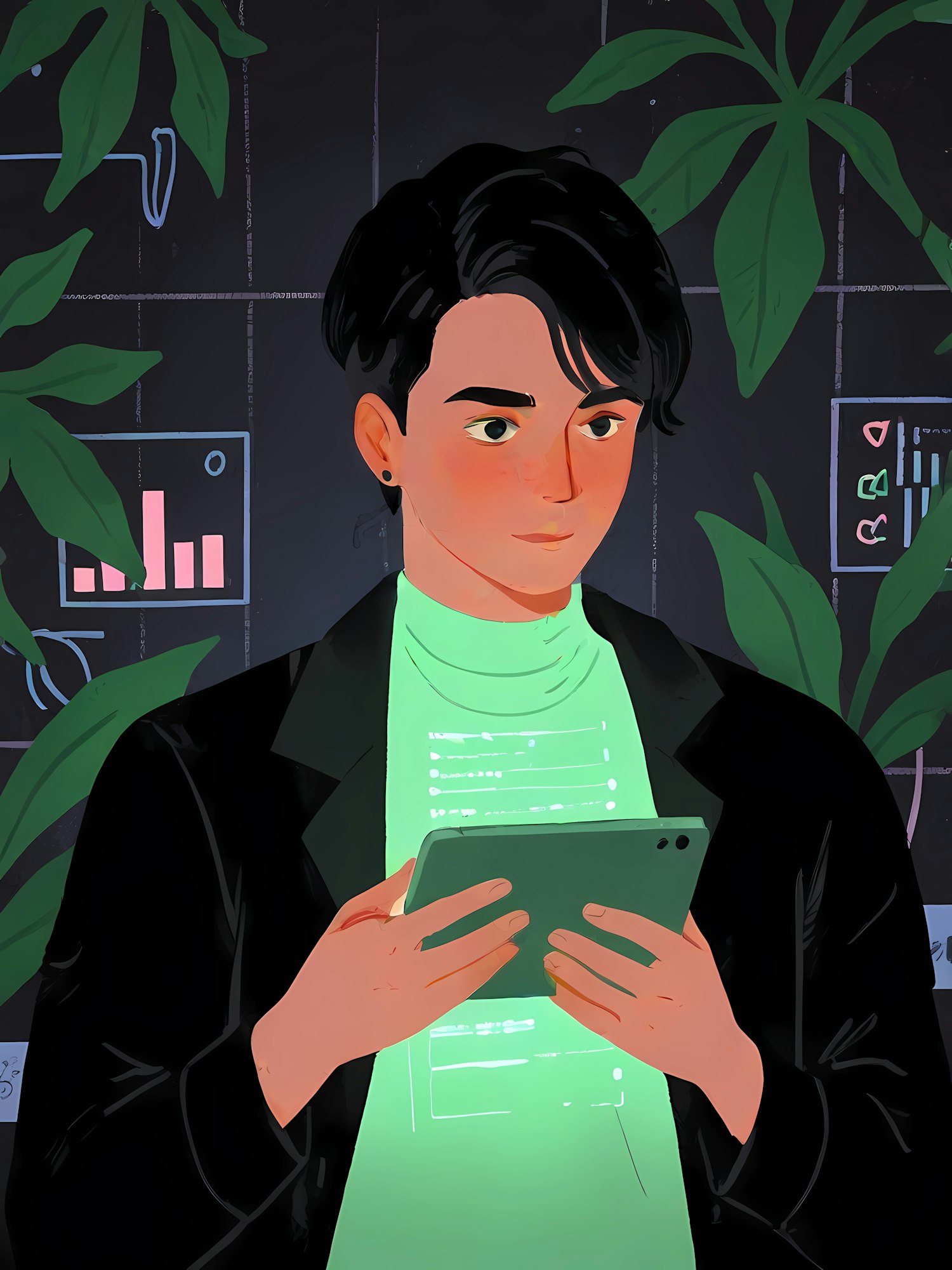 Stylized illustration of a man holding a glowing tablet, surrounded by futuristic data visuals and green leaves.