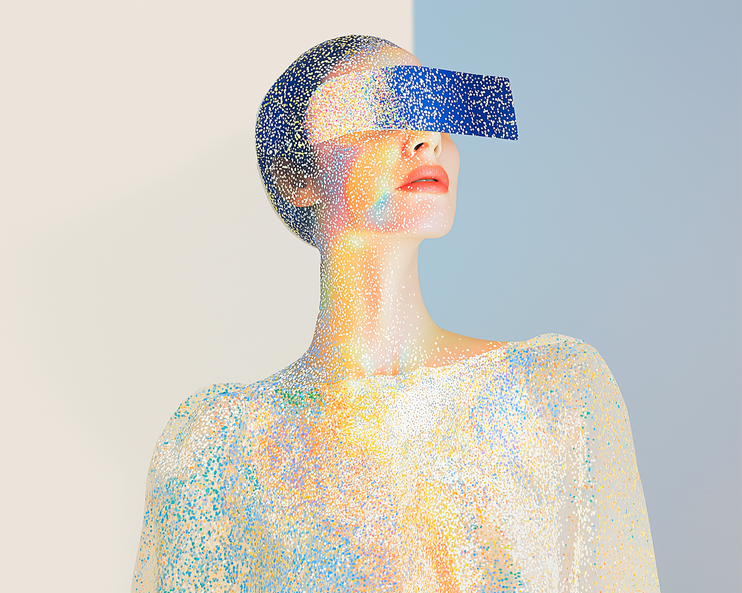 A futuristic portrait featuring a person with a shimmering multicolored texture and a sleek visor, set against a dual-tone background.