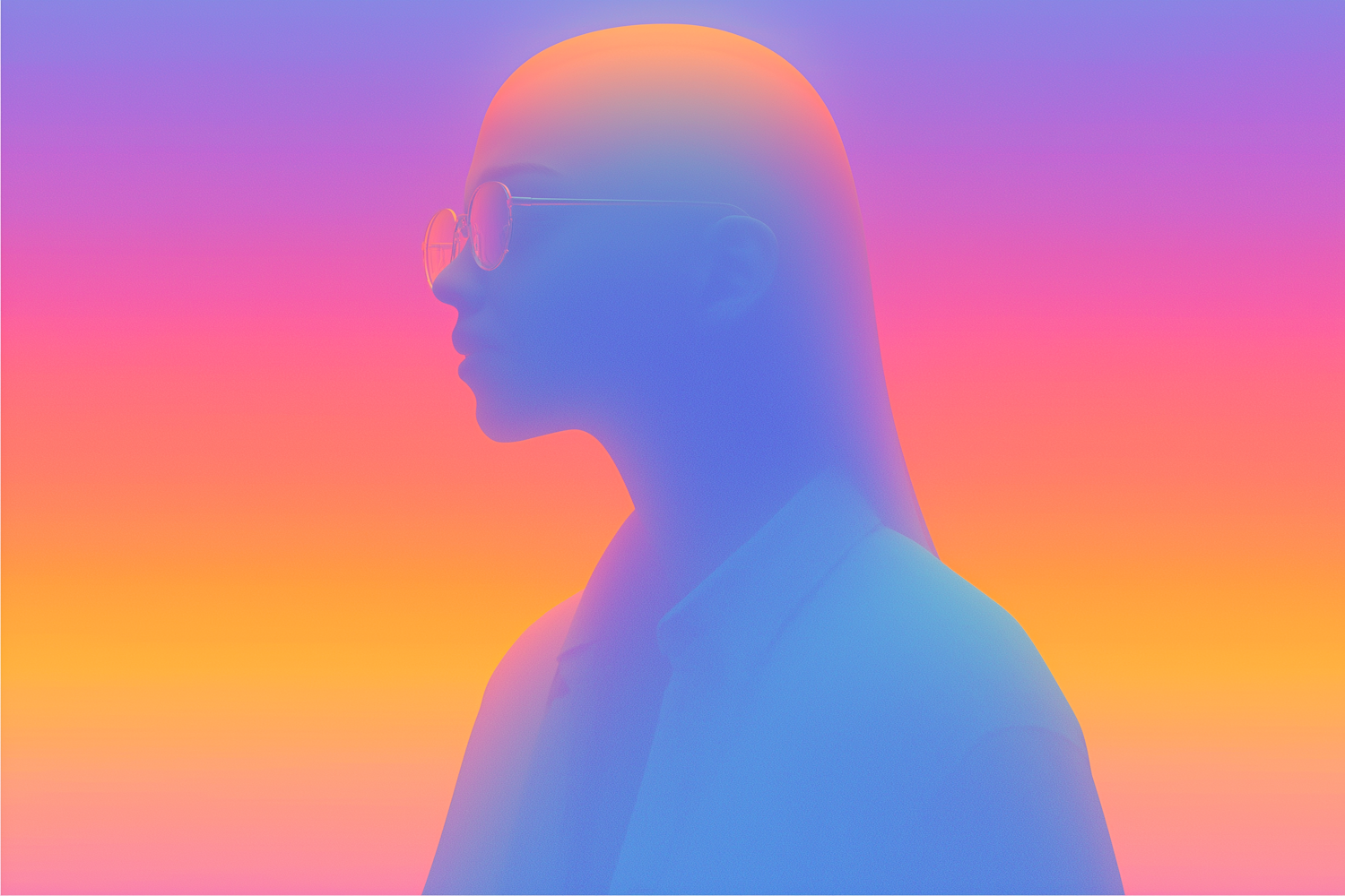 A vibrant digital artwork of a person in profile, featuring a gradient of blue, pink, and orange hues, creating a futuristic and abstract vibe.