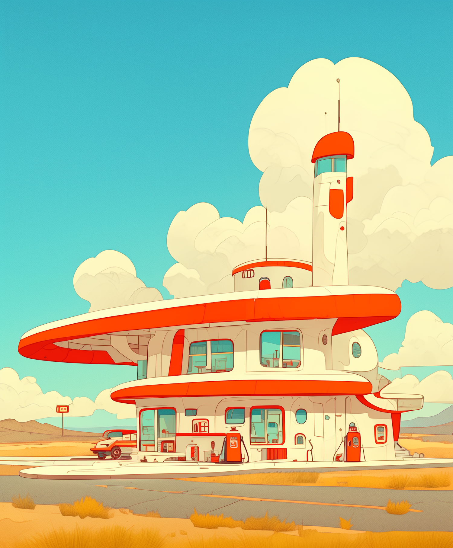Retro-futuristic gas station in a desert, featuring bold red and white design, vintage pumps, and a mid-century modern aesthetic.