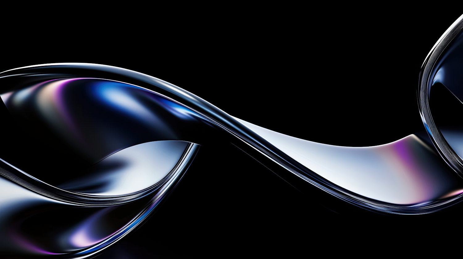 Abstract metallic ribbon with glossy curves reflecting blue, purple, and silver hues on a black background. Sleek and futuristic design.