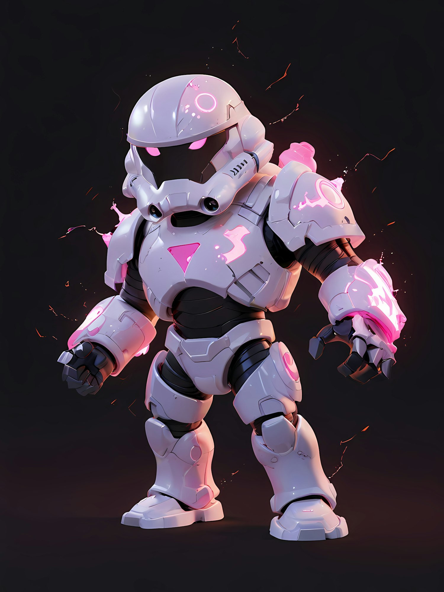 Futuristic robot in white armor with glowing pink accents and energy sparks, set against a dark background. Sci-fi and high-tech vibes.