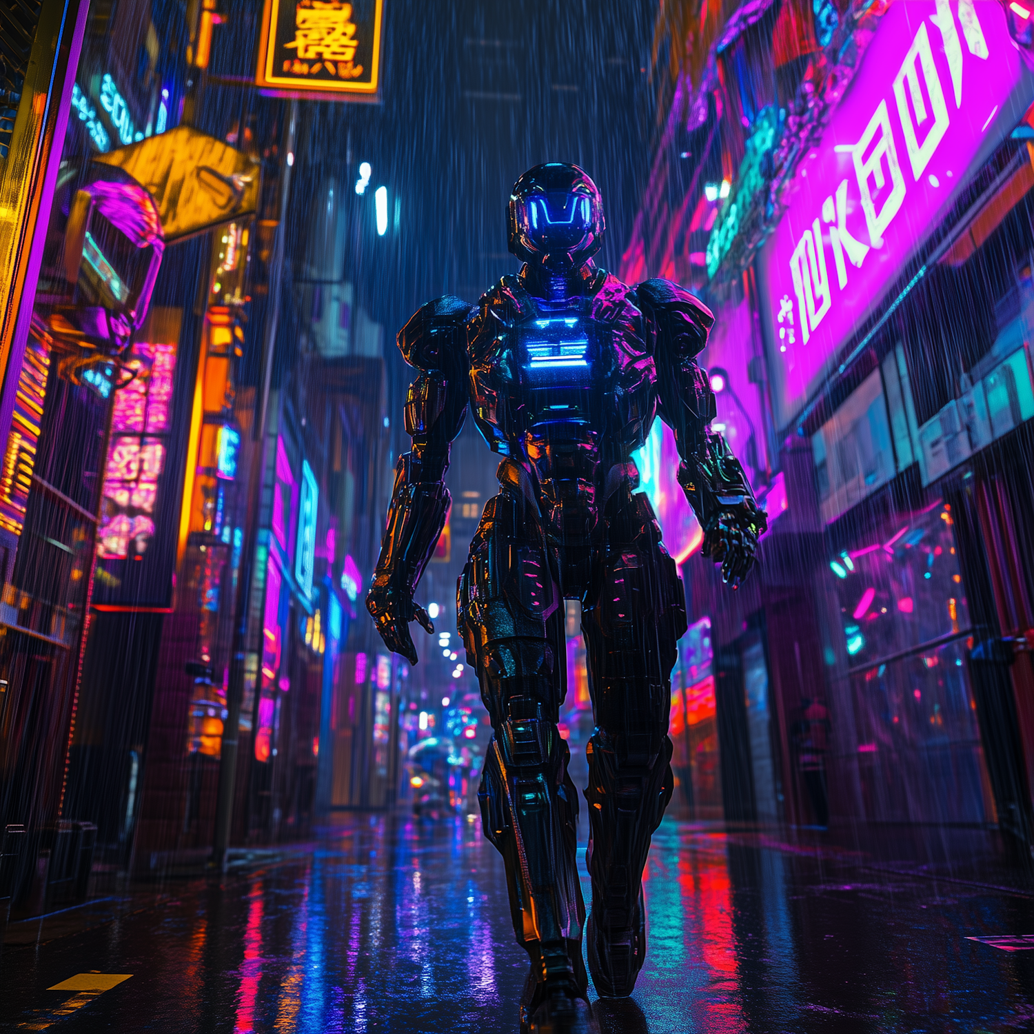 A sleek humanoid robot in a neon-lit cyberpunk city walks through rain-soaked streets, reflecting vibrant pink, blue, and orange lights.