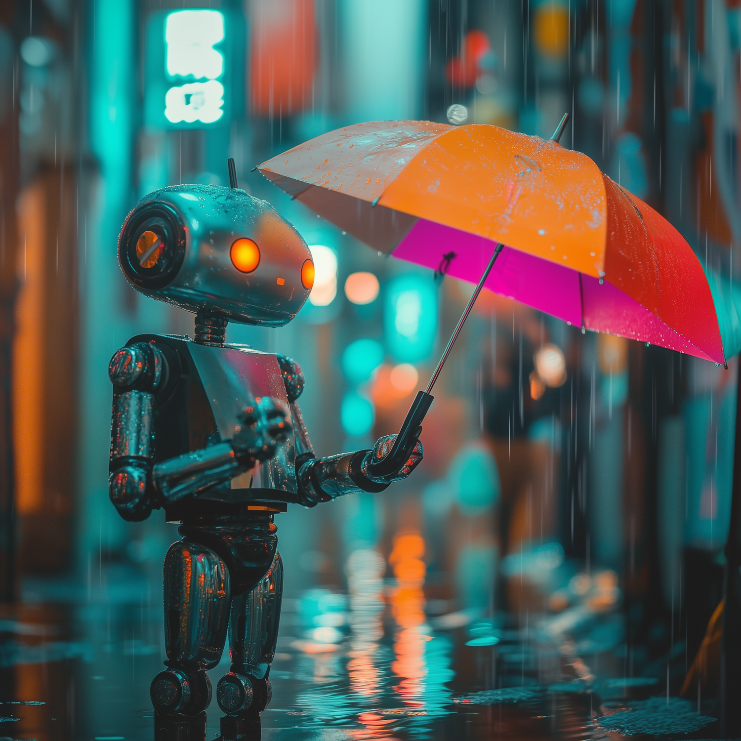 A futuristic robot with glowing eyes holds a colorful umbrella in a neon-lit rainy city, creating a vibrant and atmospheric scene.