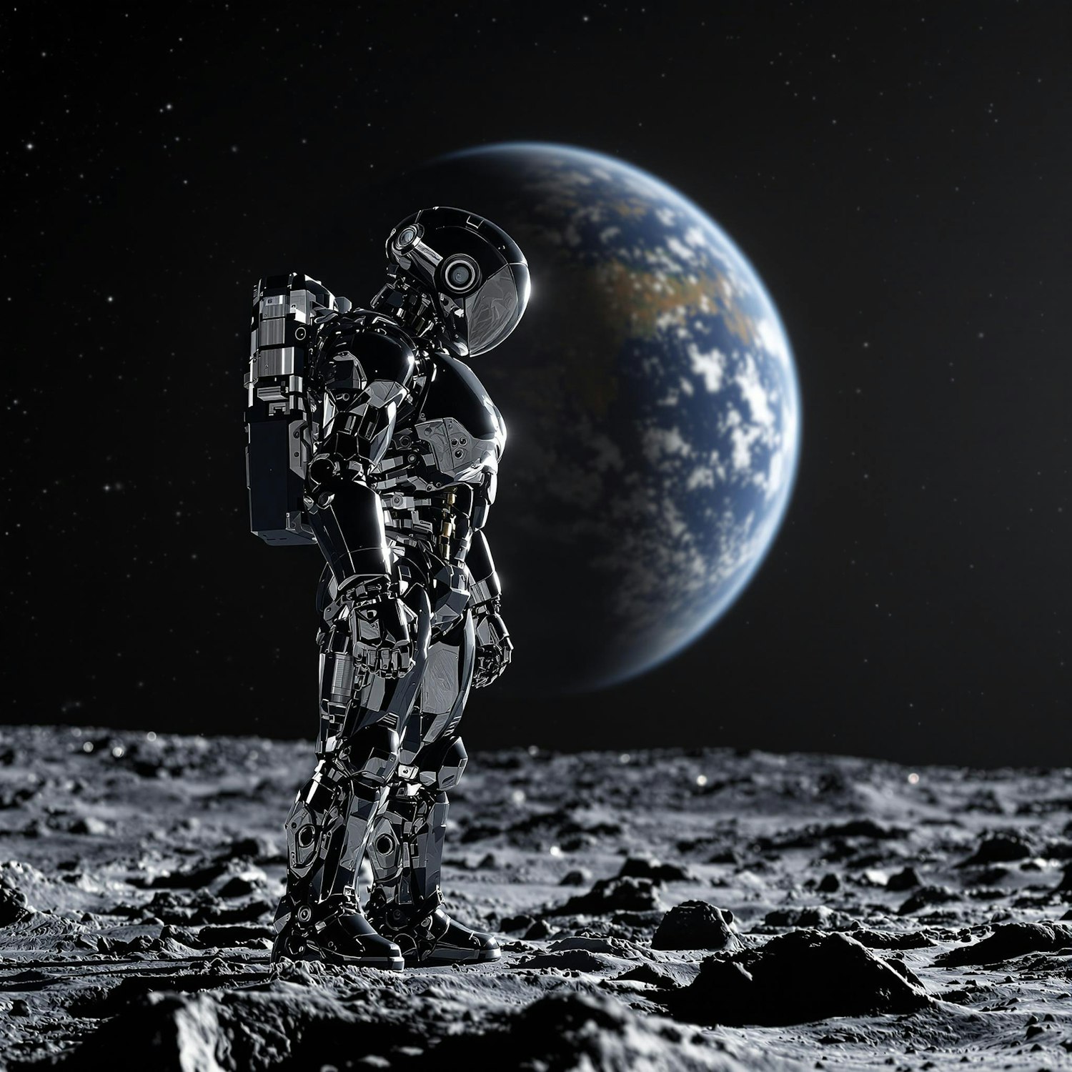 A sleek humanoid robot stands on the moon's surface, gazing at Earth in the distance. A stunning mix of technology and cosmic beauty.