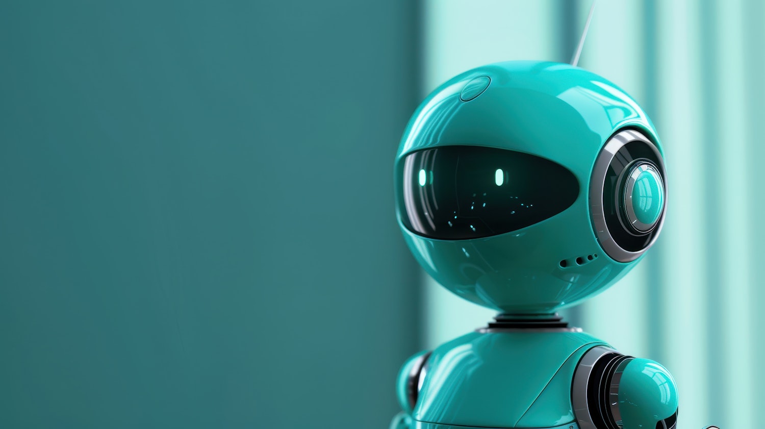 Futuristic teal robot with a glossy finish and spherical head against a matching teal background, showcasing sleek design and advanced technology.