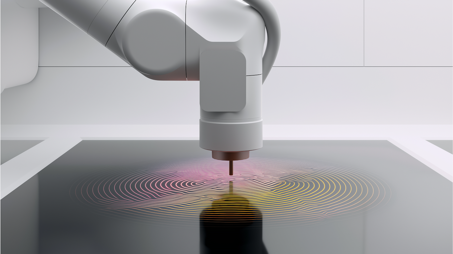 A modern robotic arm interacts with a glossy surface, creating colorful concentric ripples in a clean, futuristic setting.
