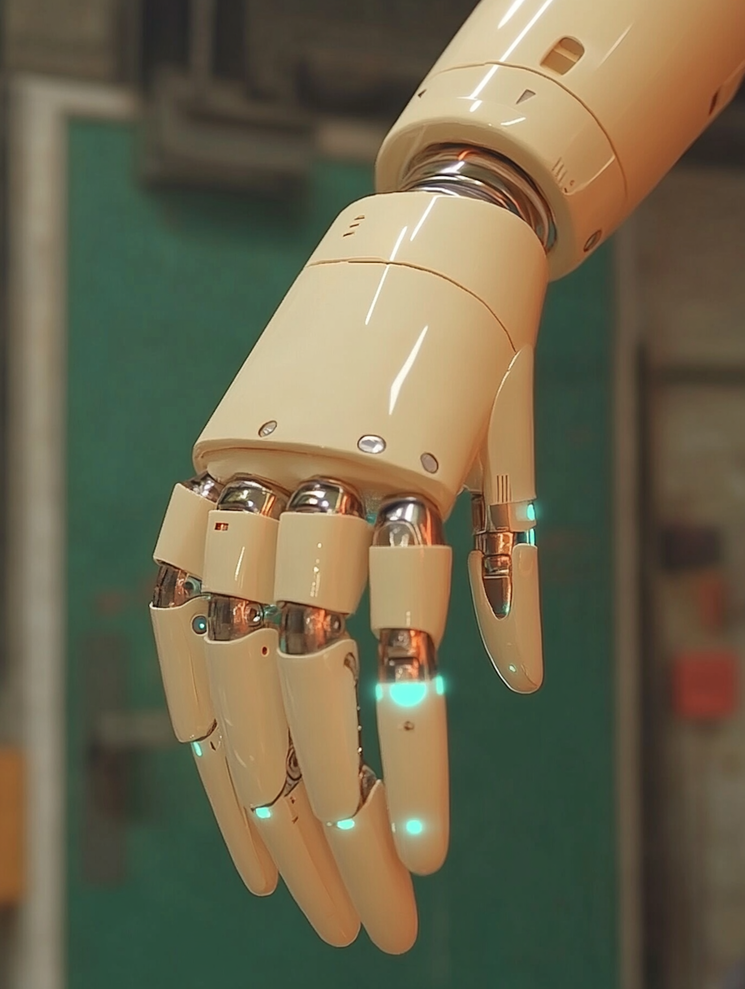 Close-up of a cream-colored robotic hand with glowing blue lights, metallic joints, and a futuristic design in an industrial setting.