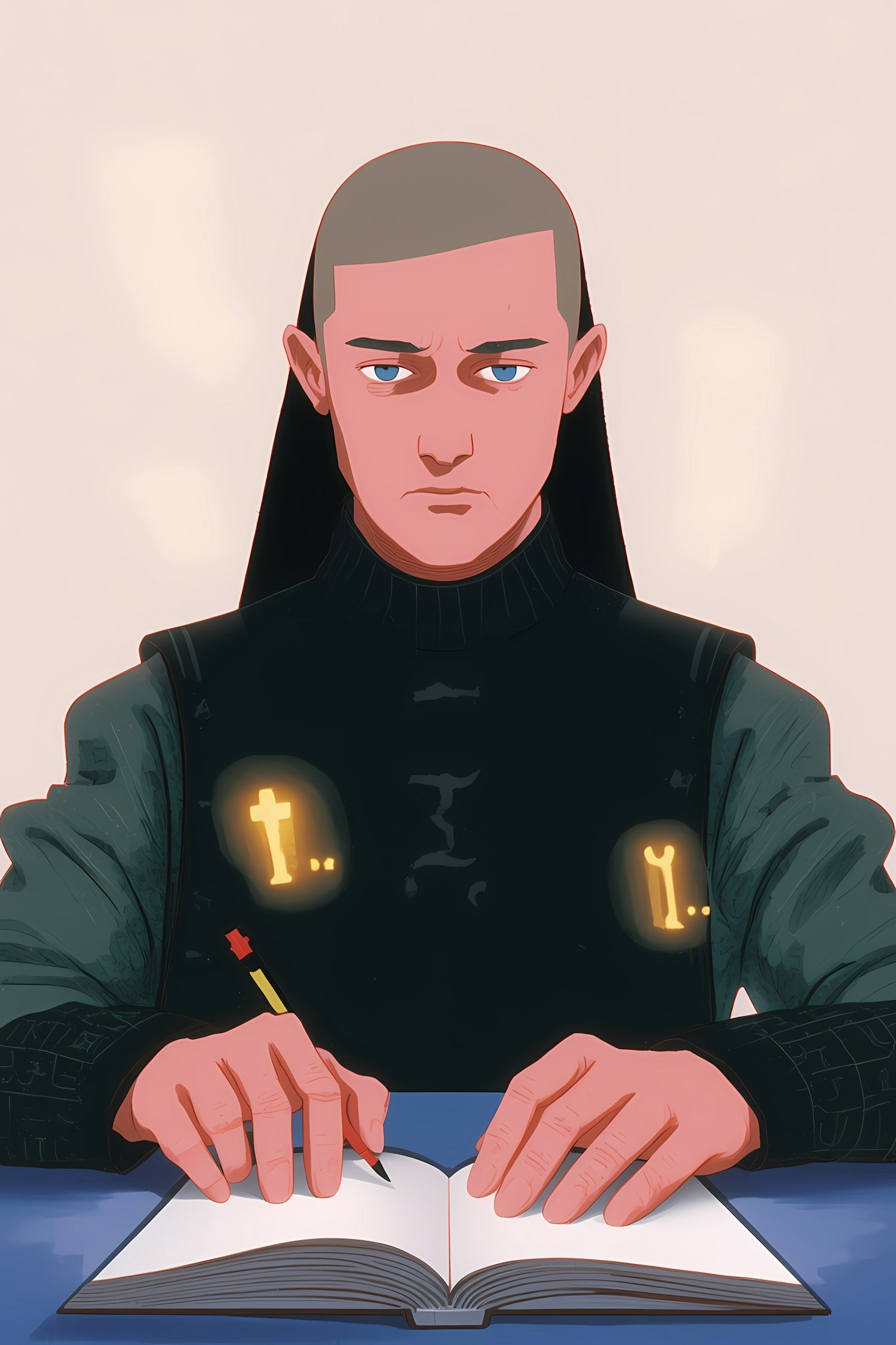 A stylized illustration of a person writing in a book, wearing a futuristic outfit with glowing symbols, set against a minimalistic background.