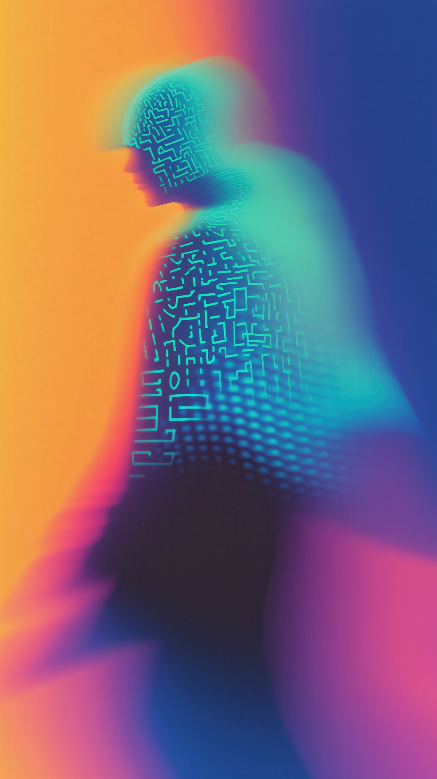 Abstract neon artwork of a human silhouette with glowing maze patterns, blending warm and cool tones for a futuristic vibe.