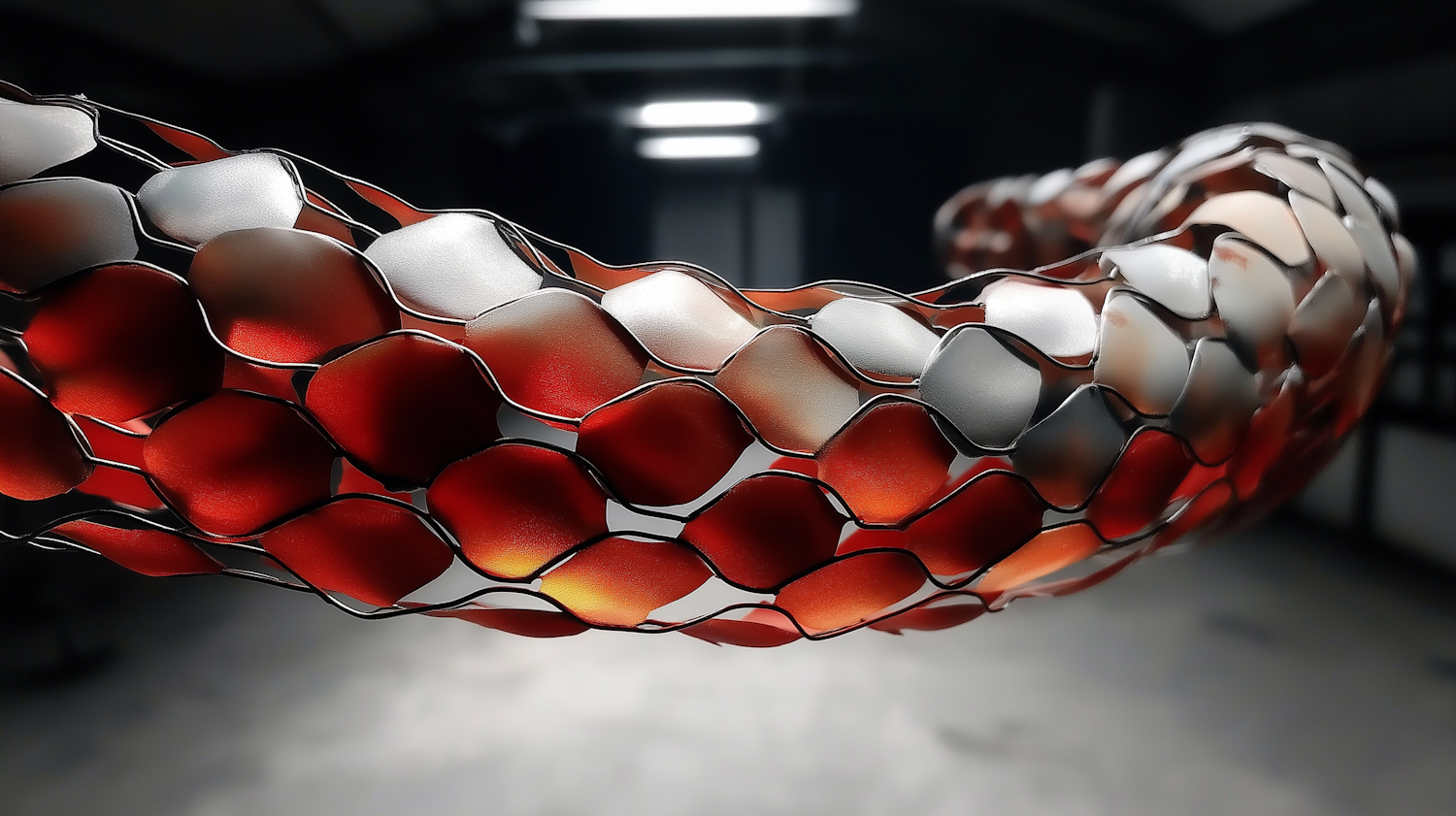 Futuristic snake-like structure with glossy red and metallic silver hexagonal panels, showcasing intricate design and flexibility.