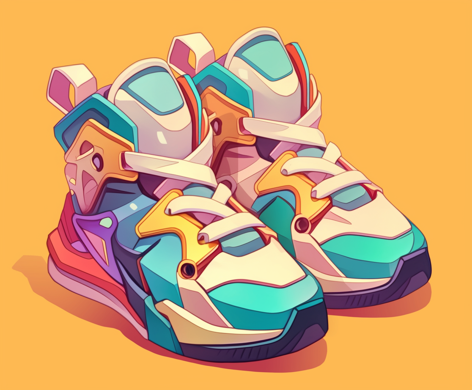 Futuristic sneakers with bold colors and geometric design on an orange background. Stylish and modern illustration.