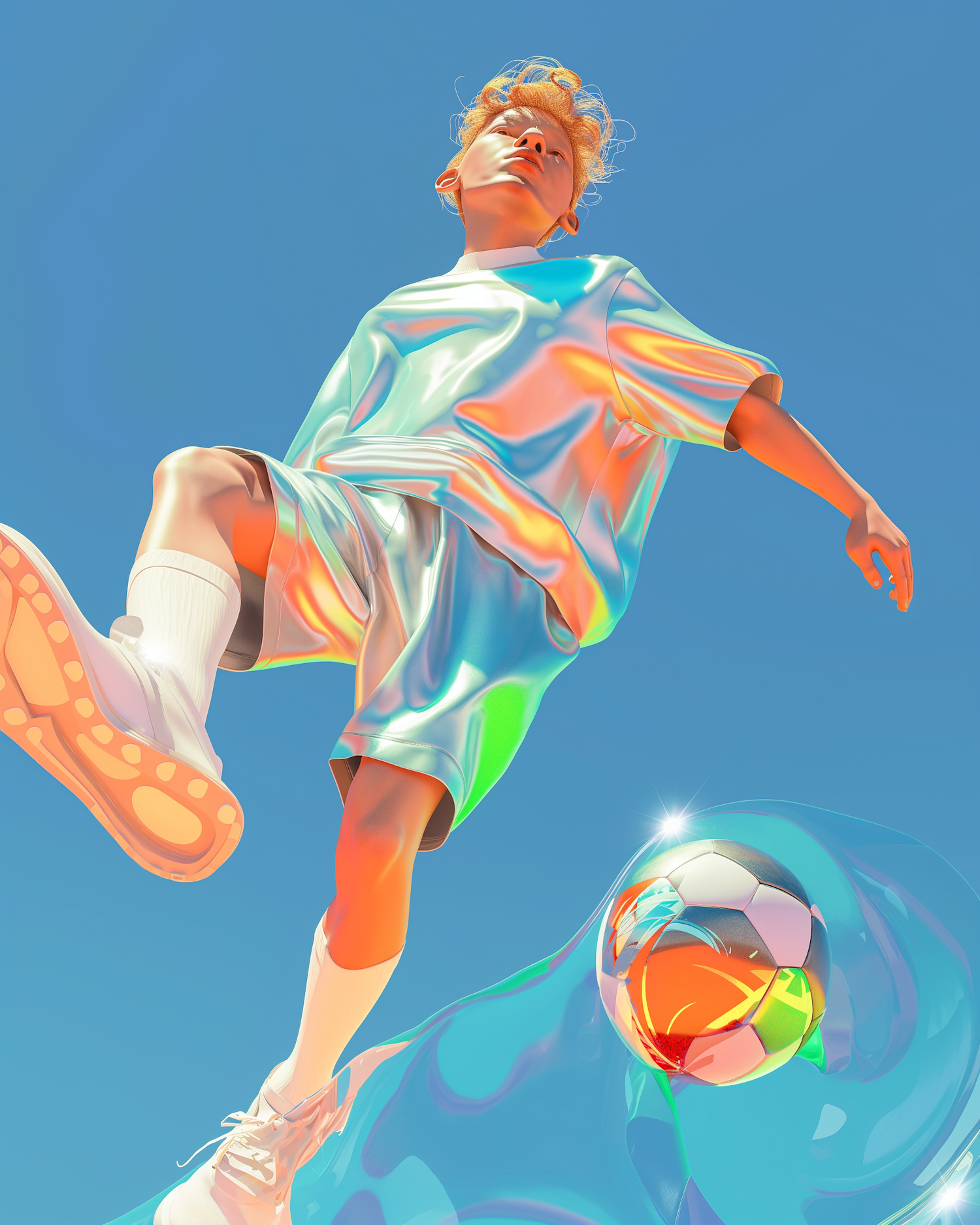 A surreal, colorful illustration of a person in iridescent clothing kicking a soccer ball encased in fluid, set against a bright blue sky.