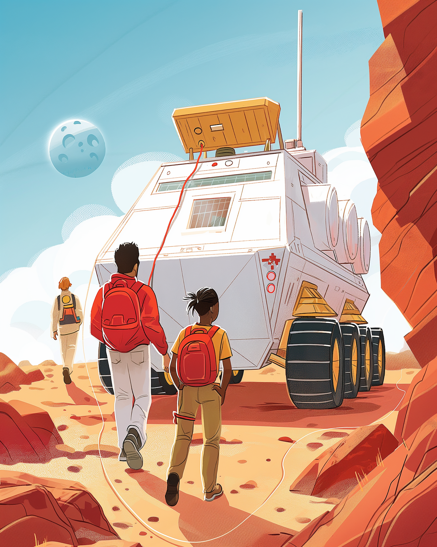 Futuristic explorers approach a large rover on a rocky, red planet under a bright blue sky with a distant celestial body.
