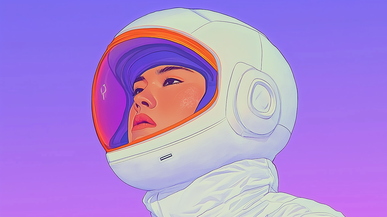 Futuristic illustration of a person in a white space helmet with an orange visor against a purple gradient background.