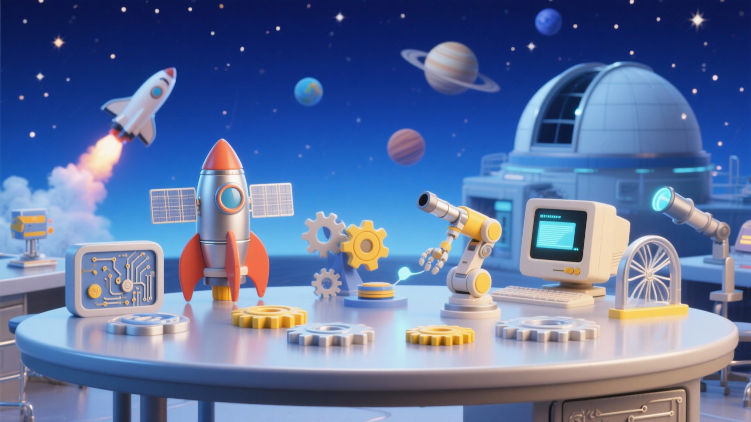 A colorful and imaginative space-themed laboratory with rockets, gears, and a starry sky, perfect for science and exploration enthusiasts.